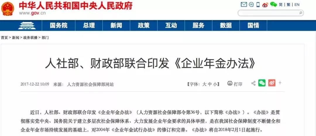 近日,人社部、財政部聯(lián)合印發(fā)《企業(yè)年金辦法》?!掇k法》將從2018年2月1日起施行。